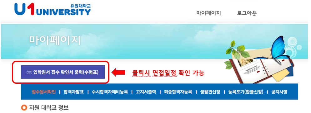 1. 입학홈페이지 마이페이지(←클릭) → 로그인 → 왼쪽 상단 '입학원서 접수확인서(수험표) 출력' 클릭 → 면접일 및 장소 확인(PC조회 권장)